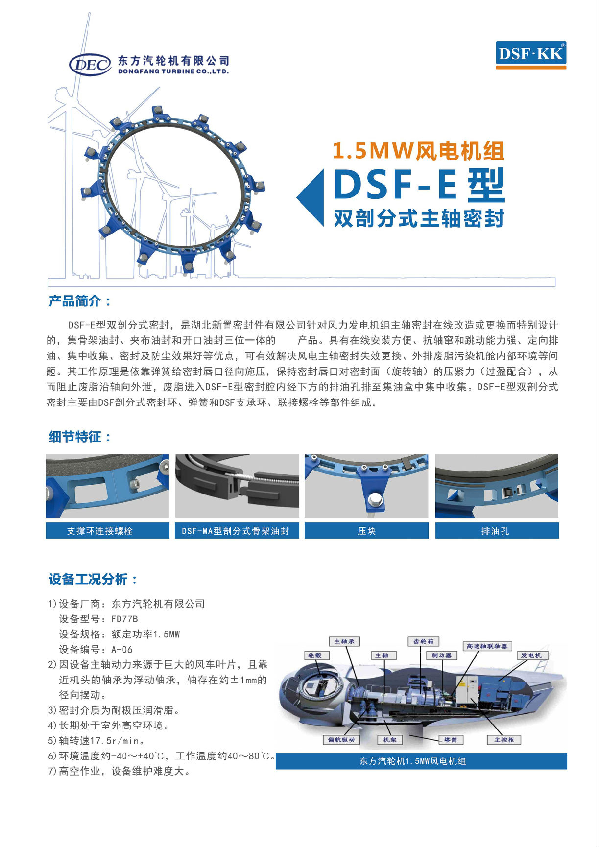 DSF-E705/719型雙剖分式開(kāi)口油封適用于東汽1.5MW風(fēng)力發(fā)電機組主軸密封在線(xiàn)技改和設備配套。