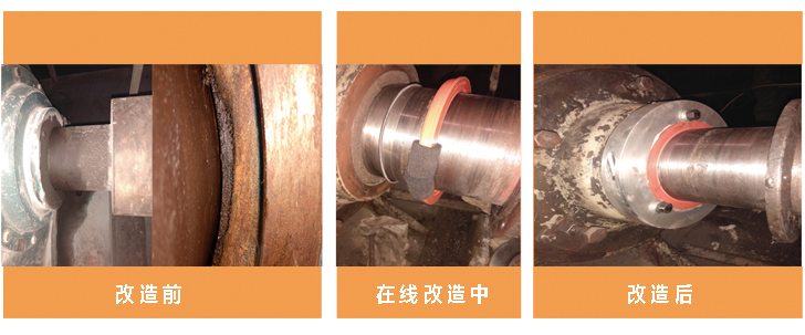 實(shí)施方案:拆除原裝迷宮密封壓蓋,借助設備原有螺栓孔用螺桿將DSF-A型剖分式支撐環(huán)固定于設備端面上,再造DSF-A型開(kāi)口油封安裝孔,將粘接掛簧好的DSF-A型開(kāi)口油封推入安裝孔中,DSF-A型開(kāi)口油封外圓周與壓蓋內圓周過(guò)盈配合,用螺栓固定壓板,將DSF-A型開(kāi)口油封固定設備端面,實(shí)現完全密封。